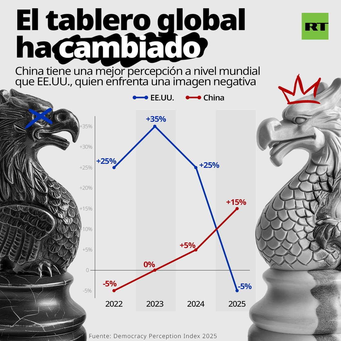 De los 96 países encuestados, el 79 % son más positivos hacia China, mientras que solo el 21 % lo son hacia Estados Unidos, según el estudio. Además, el número de personas que tiene una percepción positiva de Estados Unidos cayó del 22 % en el 2024 al -5 % este año, lo que significa que la mayoría de los encuestados tiene una visión negativa del país. Se observa que es la primera vez que más países tienen una opinión positiva de China que de Estados Unidos.