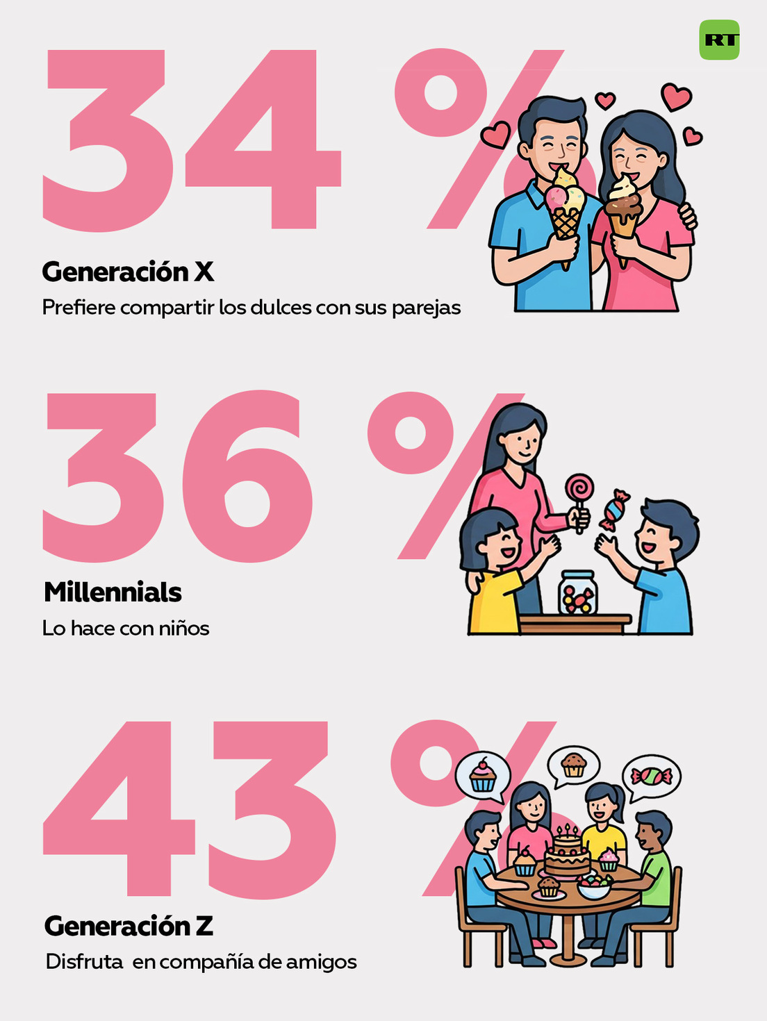 El 86 % de los integrantes de la generación Z siente la necesidad de consumir dulces, seguidos por los 'millennials', de los cuales el 81 % reconoce tener esos antojos. En conjunto, el 81 % de todos los encuestados se considera aficionado a los productos azucarados.