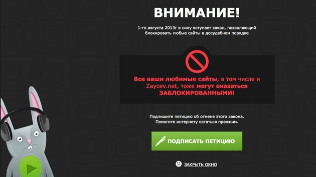 "Todas sus páginas favoritas pueden ser bloqueadas, incluso esta", decía la portada de Zaicev.net, página especializada en publicar archivos musicales.