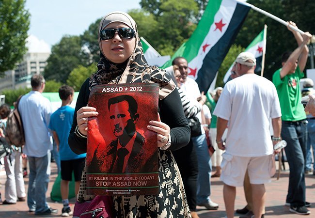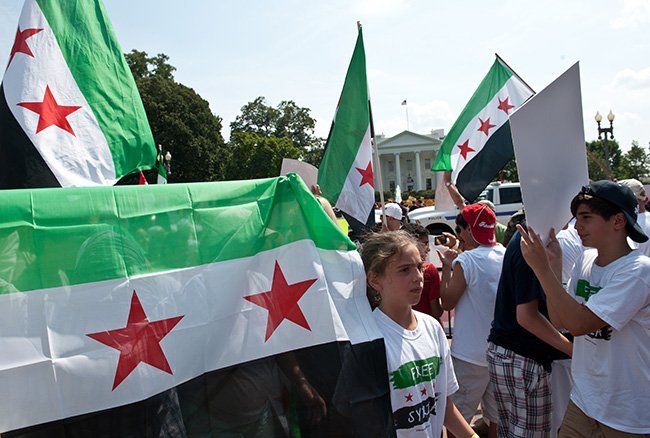 Entre tanto, un grupo de manifestantes se reunió fuera de la casa del secretario de Estado, John Kerry, en Boston gritando 'Manos fuera de Siria'.