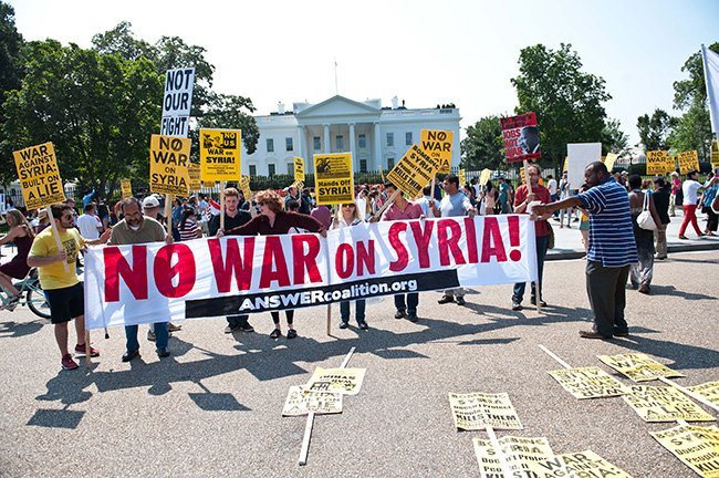 "El pueblo estadounidense no quiere esto, quiere la paz, no la guerra", dijo uno de los manifestantes. "No queremos otro Irak en Siria. La guerra en Irak se basó en la mentira. Ahora vemos que se repite el mismo escenario. No queremos que los civiles sirios sean asesinados", explicó el organizador de la protesta, Aziz Wehbey.