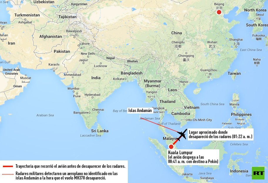 Según unas pruebas de rastreo militar por radares, el avión fue trasladado premeditadamente a través de la península de Malaca hacia las islas Andamán, informaron a Reuters dos fuentes cercanas a la investigación. Las fuentes señalaron que un avión no identificado, que los investigadores creen que era el desaparecido vuelo MH370, fue detectado por un radar militar al noroeste de Malasia.