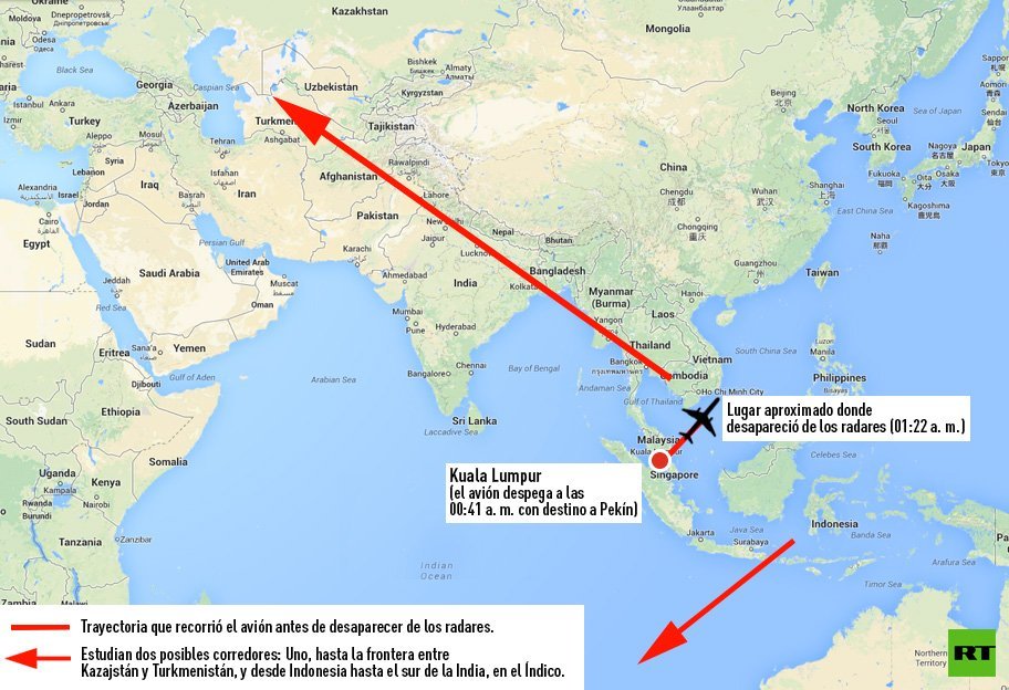 Razak recordó que hasta el momento las operaciones de búsqueda se llevan a cabo en el Mar de China, pero que estas —dijo— podrían ser abandonadas para centrarse en las dos posibles rutas que tomó el avión.