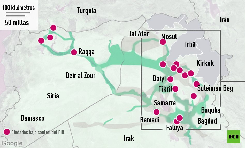 Bajo su control se encuentra ya un vasto territorio que se extiende desde las afueras de Alepo, en el norte de Siria, pasando hacia el este por el valle del Éufrates, atravesando la antigua frontera colonial en el norte de Irak y llegando hasta los suburbios de Bagdad.