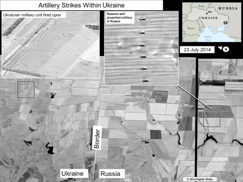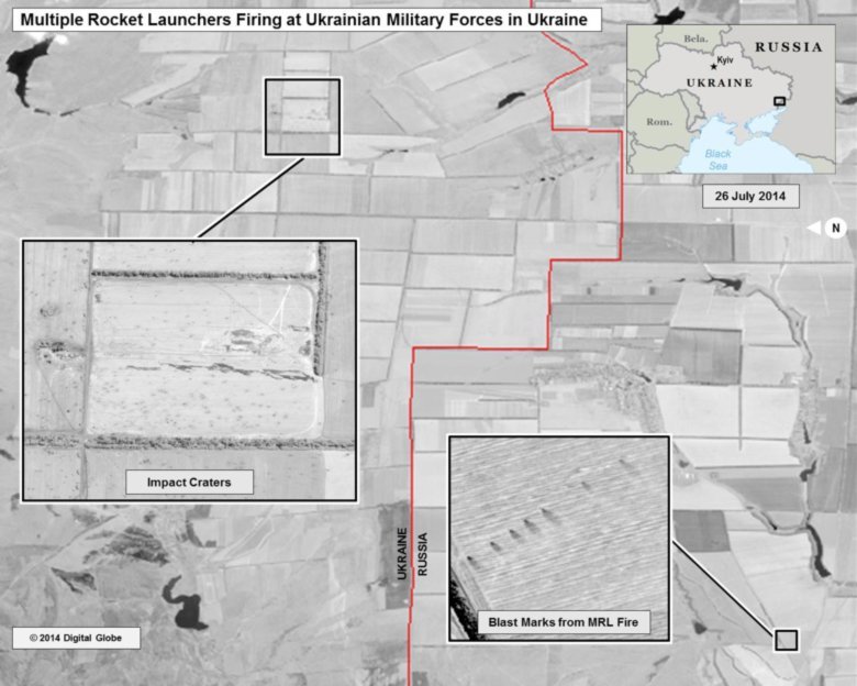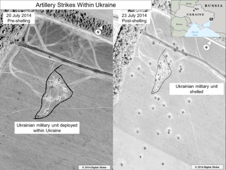 El embajador Geoffrey R. Pyatt publicó estas imágenes de satélite en su cuenta privada de Twitter. Según él, muestran que del 21 al 26 de julio Rusia disparó con artillería y lanzacohetes contra Ucrania: las flechas en las fotografías indicarían los cráteres que la artillería pesada rusa habría dejado en las posiciones de los militares ucranianos.