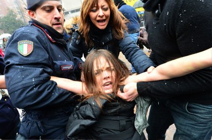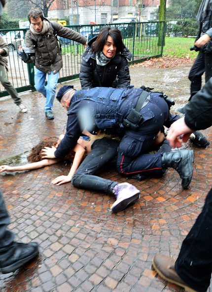Las tres jóvenes, que en principio se infiltraron entre los periodistas, recibieron al político con gritos de “¡Basta Berlusconi!”, el mismo eslogan que llevaban escrito en los pechos y la espalda.