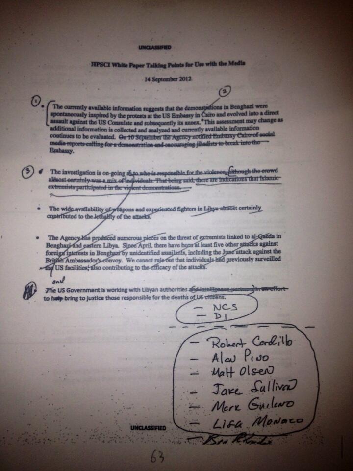 Los temas tratados en los correos electrónicos originales de la CIA incluían una referencia a que el ataque de Bengasi fue "inspirado espontáneamente por las protestas cerca de la embajada de EE.UU. en El Cairo que se convirtieron en un asalto directo contra el consulado de EE.UU. en Libia".