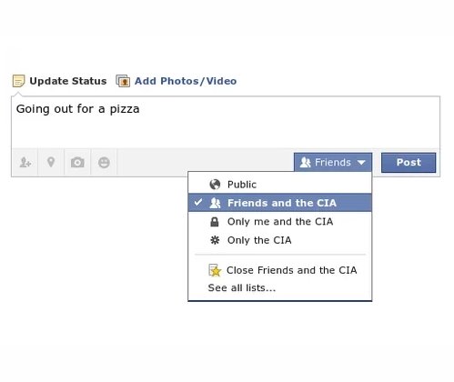 www.obeygiant.com Para burlarse de Facebook, una de las redes sociales que han sido relacionadas con el escándalo de espionaje de la NSA, algunos internautas han querido sumarse la ola de bromas haciendo circular en la Red una configuración falsa de un perfil en dicha página. Así, como se puede ver en la siguiente imagen, en la sección de "quién puede leer la información" en las cuentas de cada usuario, los usuarios bromistas han añadido leyendas como "Amigos y la CIA", "Solo yo y la CIA" o "Solo la CIA".