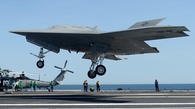 El avión no tripulado experimental X-47B, prototipo del tamaño de un avión de combate desarrollado por la empresa estadounidense de tecnología de defensa Northrop Grumman, despegó de una base aeronaval en Maryland el miércoles y después realizó un aterrizaje exitoso en el portaaviones USS George H. W. Bush en la costa de Virginia.
