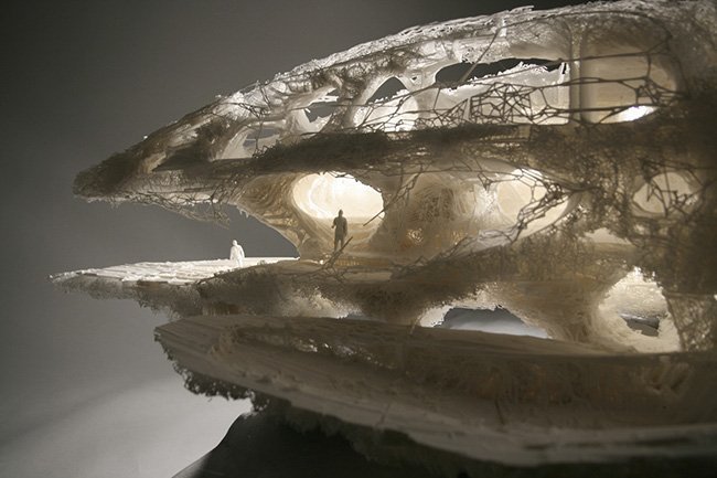El arquitecto precisa que la casa será creada a partir de un bioplástico altamente fibroso sintetizado con ayuda de láser. Las piezas fabricadas tendrán un sistema de sujeción tipo velcro y serán muy ligeras, con lo que un simple clic bastará para conectar los fragmentos entre sí, sin tornillos, adhesivos ni soldaduras.