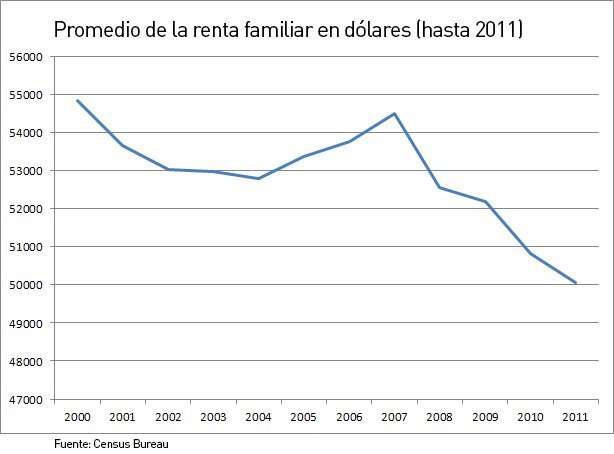 Aunque el informe establece que la renta familiar neta ha aumentado mucho desde la crisis, el periodista advierte asimismo que esto puede resultar engañoso, ya que la riqueza es desproporcionada y está en manos de los más ricos. "Los datos solo están disponibles hasta 2011, pero esto [el siguiente gráfico] muestra lo que ha sucedido con los ajustados ingresos de los hogares de EE.UU.", señala Irwin.