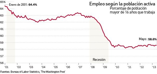 Para ello el periodista analiza un gráfica sobre el empleo y la población, señalando que el porcentaje de personas desempleadas se desplomó durante la recesión y desde entonces apenas se ha recuperado.