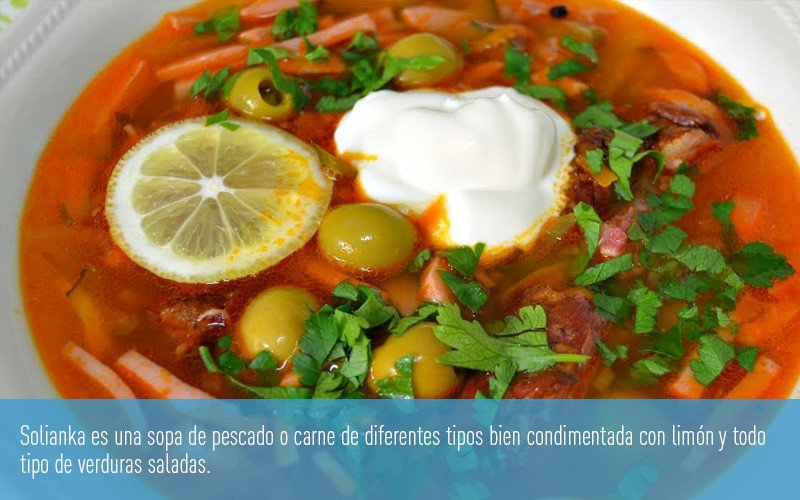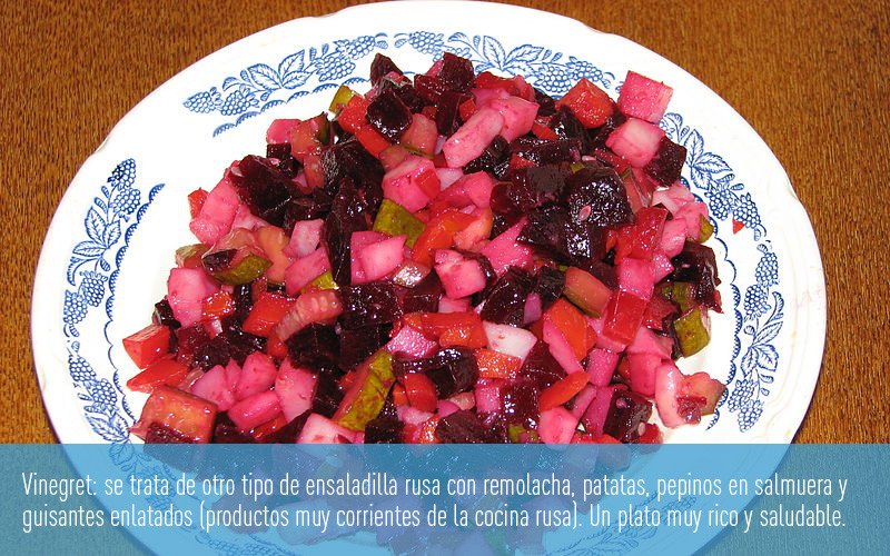 Por cierto: el primer plato en Rusia es siempre sopa, de la que existen varios tipos. Las más tradicionales son las 'schi' (sopa a base de col o chucrut y carne), el 'borsch' (sopa de un color rojo intenso por la remolacha que contiene) y la 'solianka' (sopa de carne de diferentes tipos bien condimentada con limón y todo tipo de verduras saladas).