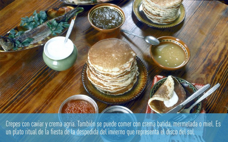 La Máslenitsa es una fiesta de origen pagano que se celebra en Rusia una semana antes del comienzo de la Cuaresma y simboliza la despedida del invierno y la llegada de la primavera. Por esa razón la comida más típica de este festejo son las crepes, que por su forma redonda y su color dorado se asocian con el sol.
