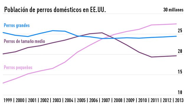 Y mientras la natalidad se reduce, crece cada año la cantidad de perros de pequeño tamaño, de menos de 9 kilos. Desde 1999 los estadounidenses vienen comprando cada año más de estos animalitos, de tal forma que su número casi se ha doblado desde entonces en los hogares estadounidenses, según la información de consultora Euromonitor, citada por 'Quartz'
